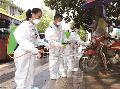 7月3日,新邵县组织干部、群众开展灾后自救,清除街道垃圾,进行全面消毒,确保受灾群众尽快恢复正常生产生活。图为该县疾控中心工作人员在进行街面消毒。
