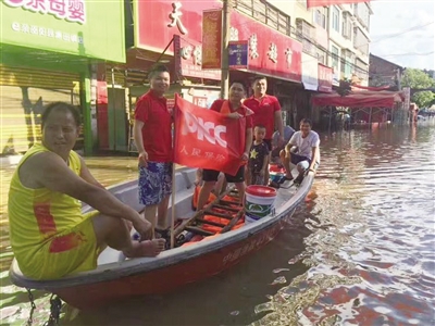 我市洪水灾情发生后,人保财险邵阳市分公司迅速启动大灾预案,成立灾后理赔工作小组,灾后理赔工作正在有条不紊地进行。图为7月2日该公司职员在邵阳县乘船前往邵阳县百货大楼复勘灾情,帮助转移清点受灾物品。