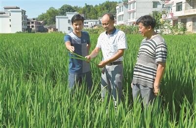 8月1日,隆回县羊古坳镇农业综合服务站站长曾令柏(中)在中稻田间指导农民识别和防治水稻病虫害。由于前段时间受持续暴雨和近期持续高温的影响,早中稻病情严重。该县24个乡镇农技人员深入田间地头,开展水稻病虫害“现场会诊”农技服务,帮助农民解决生产中存在的技术难题,确保水稻增产农民增收。
