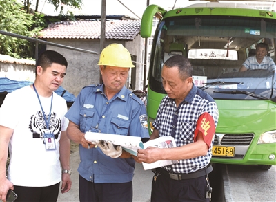 7月10日,洞口县黄桥镇副镇长谢扬标(右)在黄桥汽车站检查营运客车安全情况。近段时间以来,该镇全面排查交通安全隐患,并及时予以整改到位,做到防患于未然。
