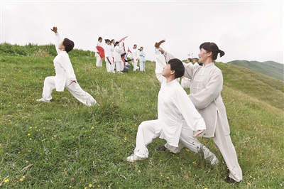 7月7日至8日,邵阳市太极俱乐部30余名爱好者亮相城步南山国家公园,开展太极表演活动,展现功夫与自然结合的魅力。图为太极老师为爱好者纠正动作。