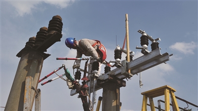 在吊车的配合下,崭新的变压器被缓慢置于变压器台架,抢修人员熟练地拆除、恢复高低压连接线,更换烧毁的铜铝接头。“再热的天,我们都得‘全副武装’,这是硬性规定。”抢修负责人姜旺春说。高温下,他们戴着手套、安全帽,穿着厚厚的工作服,背着沉重的工具包,在发热的台架和电杆上作业,不一会儿,就汗流浃背。