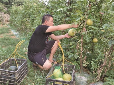 6月29日,新邵县严塘镇水云间种养合作社负责人陈智正在采摘精品西瓜。今年,该合作社种植了100余亩精品西瓜及50亩南方苹果,为30余名村民解决就近就业问题,其中包括3名贫困村民。明年,该社将采取统一供苗、统一管理、统一收购销售的模式,引领更多贫困群众发展种植产业脱贫致富。