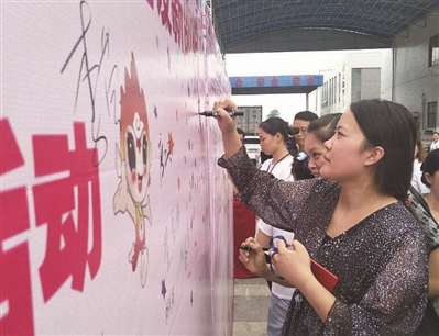 8月27日下午,邵阳口味王科技发展有限公司内,员工在主题幕布上郑重签名。当天,邵阳经开区在此举办以“当好东道主,办好省运会,建设新邵阳”为主题的万人签名大会,该公司及经开区各部门共6000多人参加签名活动。