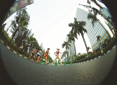 8月29日,中国选手杨家玉(右一)和中国选手切阳什姐(右二)在比赛中。当日,在印度尼西亚雅加达举行的第18届亚运会田径女子20公里竞走比赛中,中国选手杨家玉与切阳什姐分获冠军和亚军。