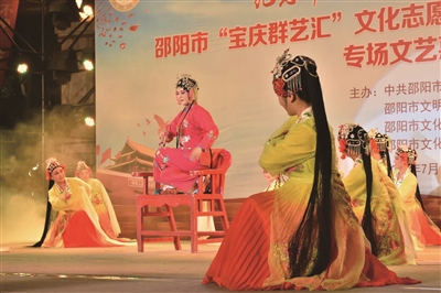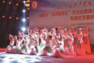 7月1日晚,庆祝新中国成立70周年系列活动“共建文明城 建设新邵阳”——纪念中国共产党成立98周年暨邵阳市“宝庆群艺汇”文化志愿服务队专场文艺惠民演出在城南公园举行。演员们以最真挚的情感,讴歌党的丰功伟绩,歌颂中华美德和浓浓家国情怀。