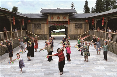 7月1日,游客在湖北省恩施土家族苗族自治州宣恩县珠山镇车洞坪民宿旅游区体验土家族“八宝铜铃舞”。 炎炎夏日,人们开展丰富多彩的活动休闲度夏。 宋文 摄