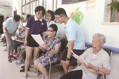 8月2日,邵阳正康老年驿站迎来了一群可爱的志愿者——湘郡铭志学校G1804班学生。他们来到驿站看望慰问老人,为老人送去水果和爱心祝福卡片,用关爱行动表达爱老敬老之情。图为同学们与老人一起练习唱歌。