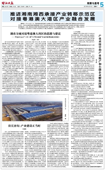 编者按:7月29日至31日,“推进湘南湘西承接产业转移示范区对接粤港澳大湾区产业融合发展”高峰论坛系列活动在我市举行。活动旨在探索湖南对接粤港澳大湾区产业发展的路径和方法,加快推进湘南湘西承接产业转移示范区建设,促进经济高质量发展。此前,湖南省政协围绕“推进湘南湘西承接产业转移示范区对接粤港澳大湾区产业融合发展”这一课题,向海内外广泛征集论文,共收到论文205篇,评出优秀论文64篇,并结集成书。本报将陆续刊登相关论文,敬请关注。