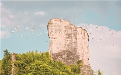 近年来,随着污染防治攻坚战的持续推进,崀山世界自然遗产地环境得到进一步改善,夫夷江两岸绿树成荫,山清水秀,吸引了众多白鹭常驻崀山。它们在景区上空来回飞翔,为大自然生态增添了一道亮丽的风景。图为8月3日,新宁县崀山镇崀山村河岸“将军石”前,成群结队的白鹭在嬉戏翱翔。