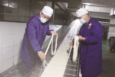 当晚10时许,记者走进该公司米粉加工生产车间,只见车间内灯火通明,工人们戴着口罩在生产线上将蒸煮冷却成型的米粉打包入袋。车间主管姚述中介绍,在加工米粉前,首先要反复淘洗大米,然后浸泡,接着把大米磨成米浆,放进高温蒸煮设备进行第一次蒸煮,然后通过设备加工成型,再进行第二次蒸煮,待成型的米粉冷却后就可以打包了。