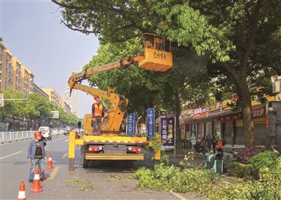 随着气温的走高变化,市城区绿化树木进入快速生长期。连日来,市街道绿化管理所组织园林工人对管护范围内主干道的行道树进行集中修剪,打造美观安全的绿化景观。图为园林工人在宝庆中路沿线修剪行道树。