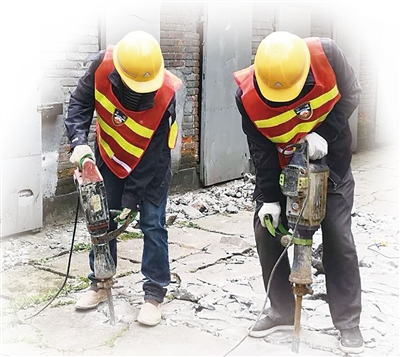 4月18日,双清区小江湖街道塔北社区染料厂小区内,“加快旧城改造”的宣传横幅十分醒目。改造工程项目施工队忙得不可开交,工人们或钻旧墙、铺新砖,或安装水管、预埋电缆,施工场面忙中有序。