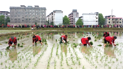 当天,该县七江镇千古坳村,党旗飘飘,党徽闪耀,数十名县级领导和党员干部来到田间地头,或组织指导插秧比赛,或卷起裤脚下田体验插秧。县委书记王永红、县长刘军的插秧手法不逊于专业插秧手,横竖对齐,又好又快。数十名学生代表也在水田里比拼插秧技能,上了一堂特殊的劳动实践课,感受到“劳动最光荣、最崇高、最伟大、最美丽”。