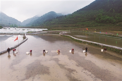 离河道稍远的地方,一群妇女弯腰将藕种埋入尺余深的水中。将身后半箱藕种插下去后,全村200亩荷花鱼养殖基地里的莲藕就全部种完了。