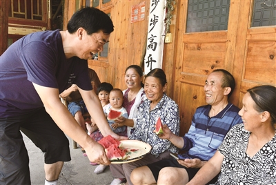 7月14日,省工商联驻村帮扶工作队队长朱冬成(左一)给康复中的邹家平(右二)及村里乡亲端上西瓜。邹家平曾是城步苗族自治县儒林镇龙凤冲村11组的贫困户,今年6月不幸患重病。省工商联驻村帮扶工作队为邹家平筹集爱心款3.12万元,帮他及时渡过难关。当天,朱冬成率队员带西瓜再次上门看望他。