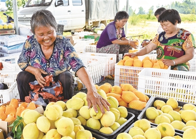 近年,洞口县加大新农村建设投入力度,采取“合作社+基地+种植大户+农户”模式,引导农民发展特色林果产业,推进了产业扶贫、农民增收。图为7月18日,石江镇石塘村桃源种植专业合作社的社员正在将采摘下来的黄桃进行挑选并分类包装。